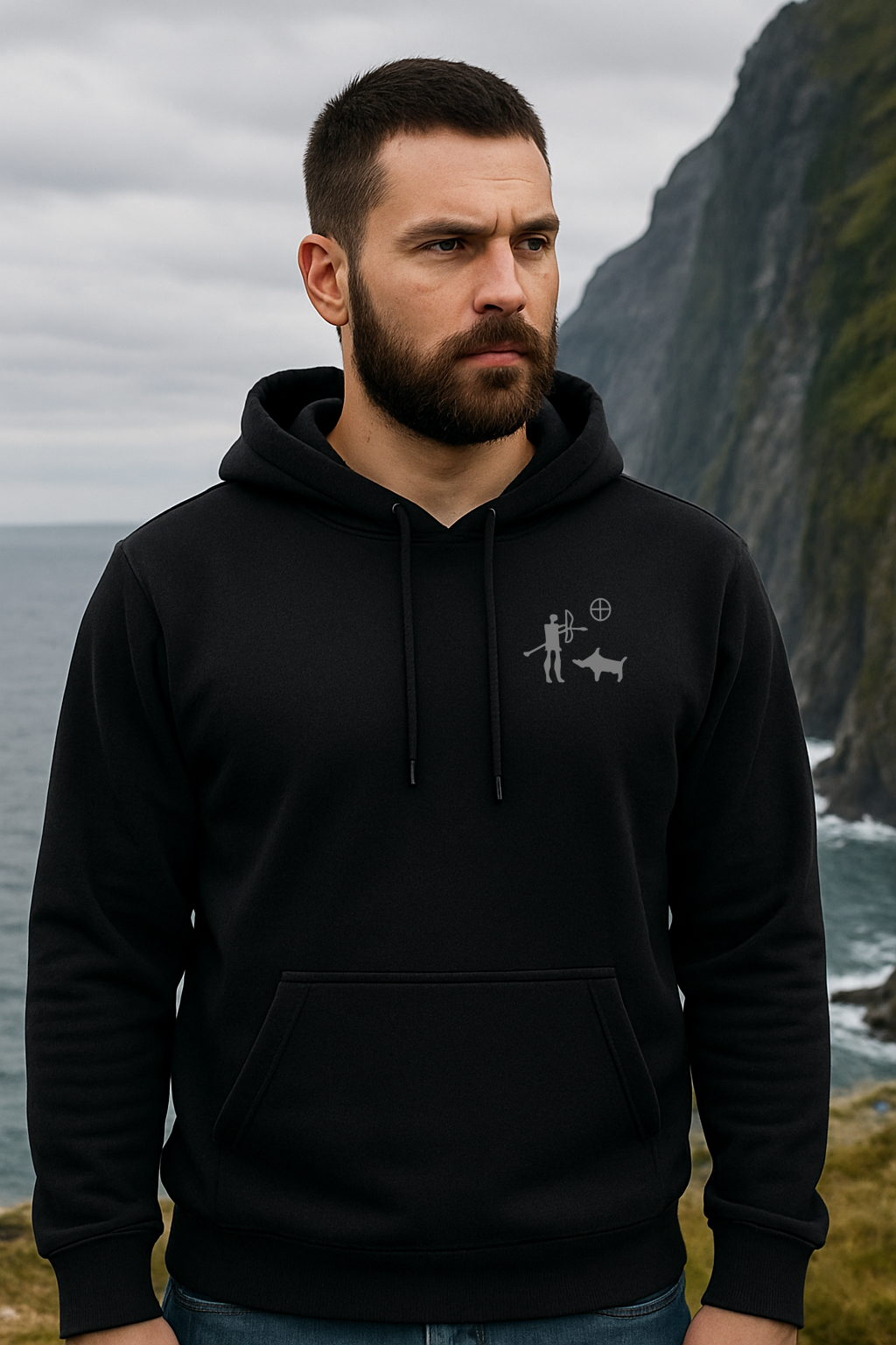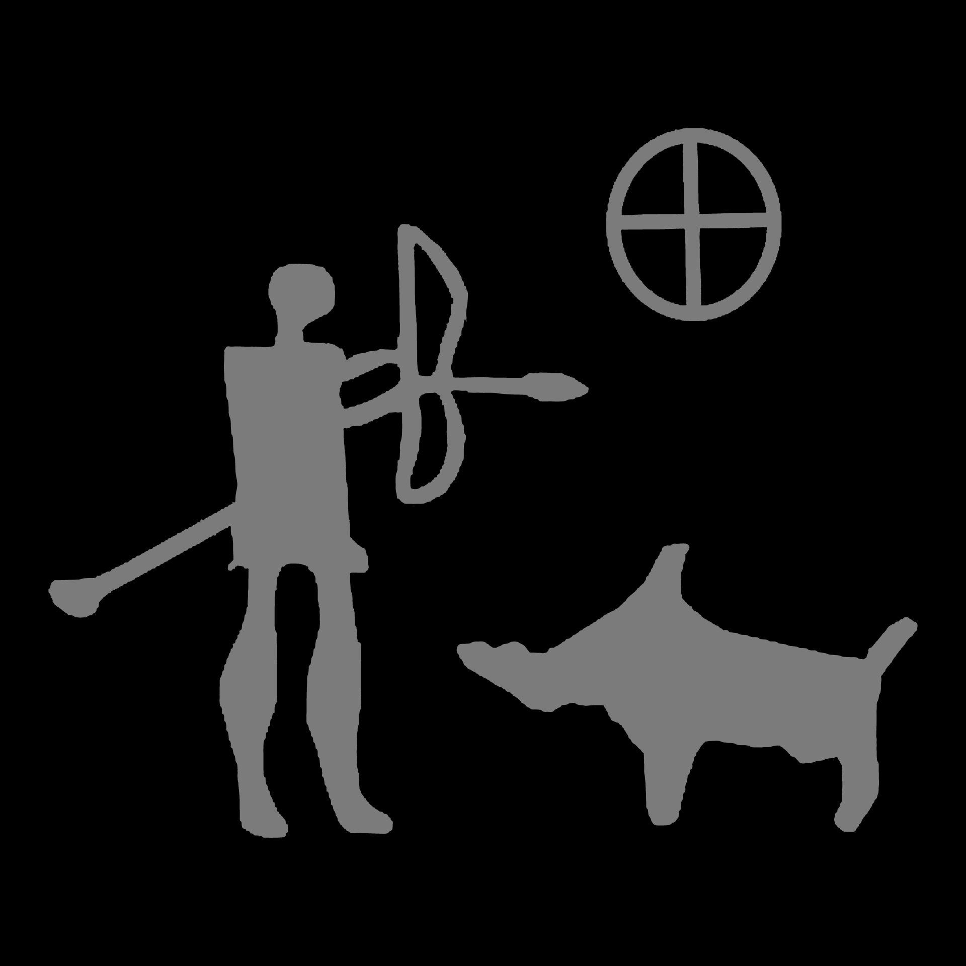 Unsere Jagdszene zeigt einen mit Pfeil und Bogen bewaffneten Jäger, sein Beutetier (einen Eber) und die traditionelle Darstellung der Sonne. Das Motiv ist an die Petroglyphen aus Schweden und Dänemark angelehnt.