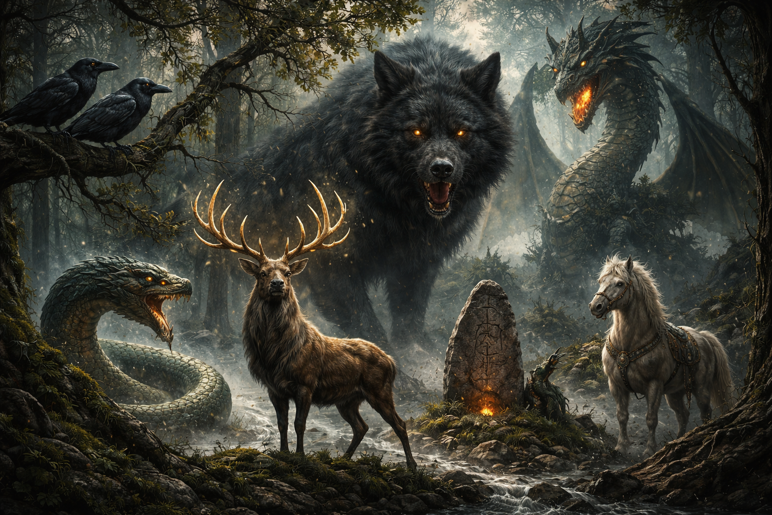 Tiere bevölkern nicht nur in der germanischen Mythologie die Welt der Götter und Menschen. Der mächtige Wolf Fenris lauert seinem Schicksal entgegen, während die Midgardschlange Jörmungandr die Welt umspannt. Raben fliegen über die Schlachtfelder und bringen Odin Wissen und Erinnerung. Ein Eber zieht den Wagen Freyrs und spendet Licht. Hirsche und Pferde erscheinen als Zeichen von Kraft, Schutz und Übergang zwischen den Welten. Diese Tiere verkörpern die Naturgewalten und spiegeln die enge Verbindung zwischen Mensch, Gottheit und Natur wider.